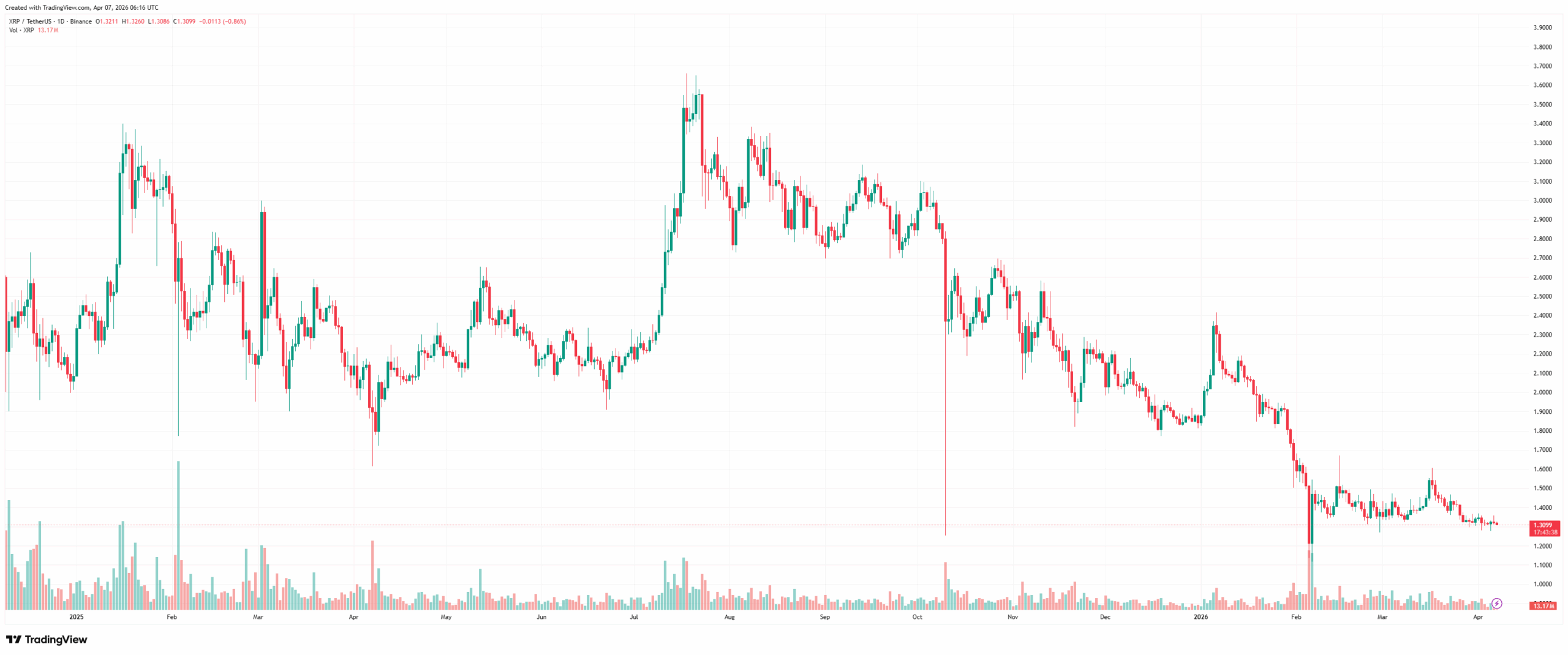 XRP’s price declined to around $1.31 on April 7th, down 2.5% over the past 24 hours. This brings its total losses for the past two weeks to 7.3% and close to 30% for the last year.