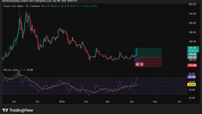 Zcash crypto hit a $340 midweek peak before retreating slightly to its $332 press time price. The privacy coin also retested the upper range of its 2-month consolidation range.